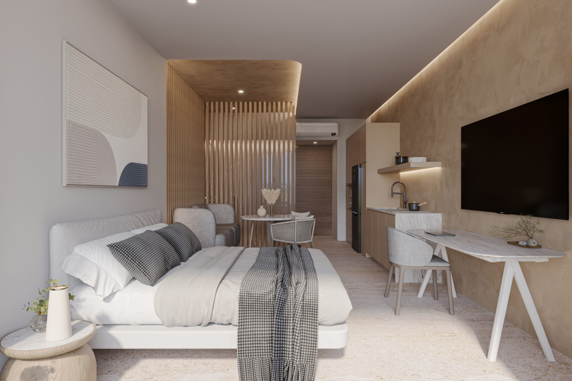El desarrollo ofrece un universo de amenidades al nivel de un resort cinco estrellas, elevando la experiencia de vivir en un estudio a una propuesta incomparable. La playa se convierte en tu extensión natural gracias a terrazas frente al mar, una piscina infinita con cabañas, restaurante, servicio al cuarto, kayaks, paddle boards y una cabaña deportiva para disfrutar del entorno costero. El rooftop ofrece un ambiente sofisticado con sky bar, jacuzzi y terraza sky ideal para atardeceres inolvidables. Para el bienestar y la productividad, encontrarás gimnasio, carril de nado, coworking, cuarto de juegos y acceso a transporte interno, bicicletas eléctricas, valet y recepción.
